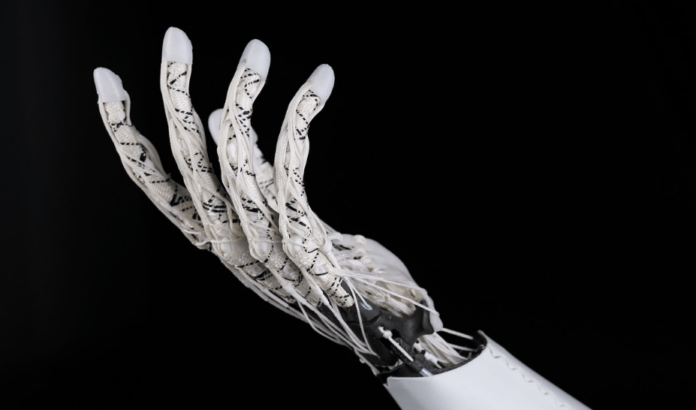 A robotic finger, for example, can be built from a small number of bone-like elements, held together by hundreds of fine fibres that wrap around and anchor into the structure itself, similar to connective tissue in the human body.